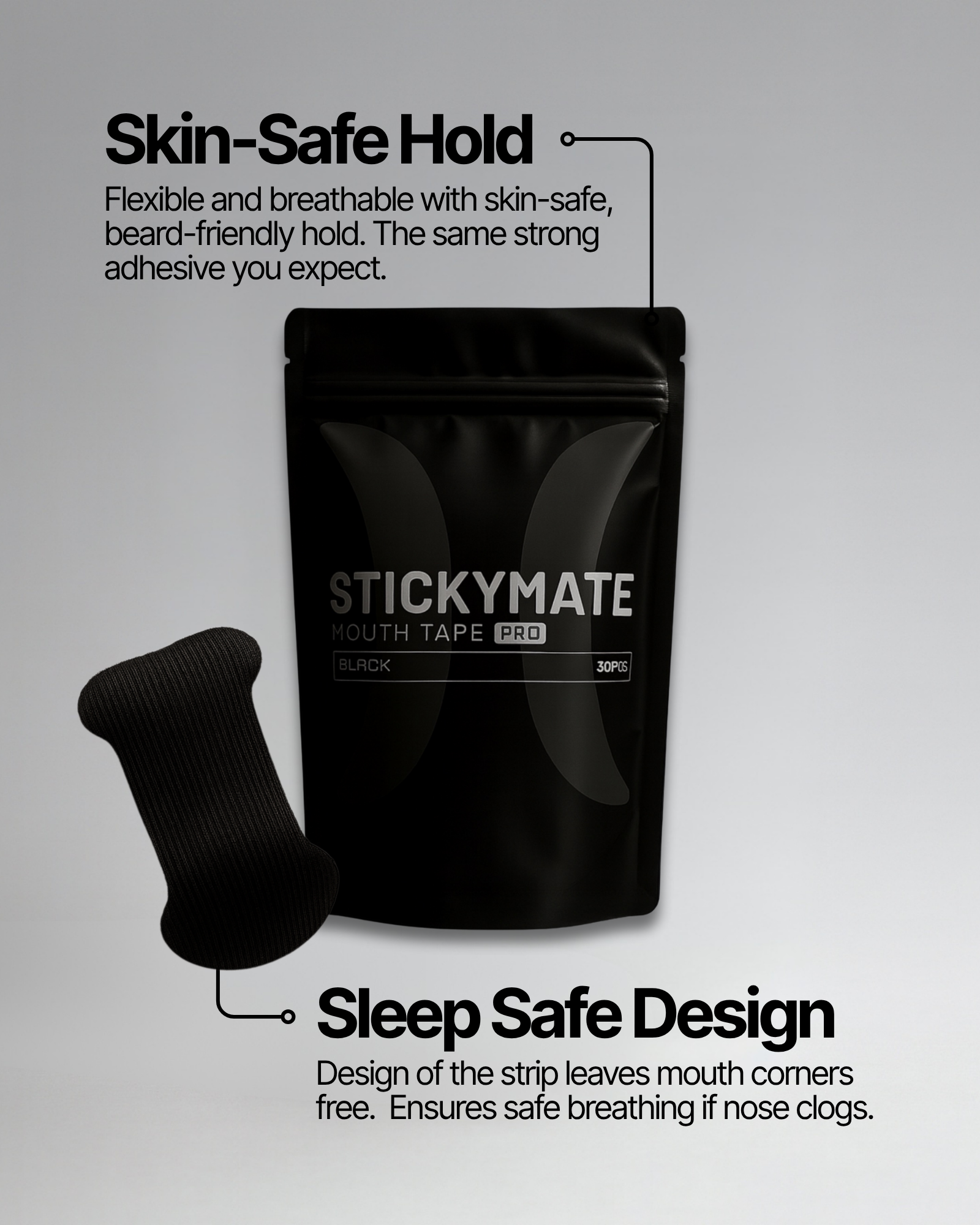 Sticky Mate mouth tape gently keeps your lips sealed during sleep, encouraging nasal breathing. Nose breathing filters, humidifies, and warms air—leading to deeper sleep, less snoring, and waking up without that dry-mouth desert feeling.