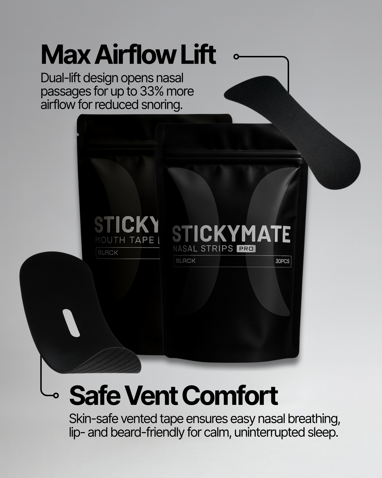 The Sticky Mate Bundle Pro combines our premium Nasal Strips and Mouth Tape to create the complete breathing solution — open airways, encourage nasal breathing, and wake up truly restored.